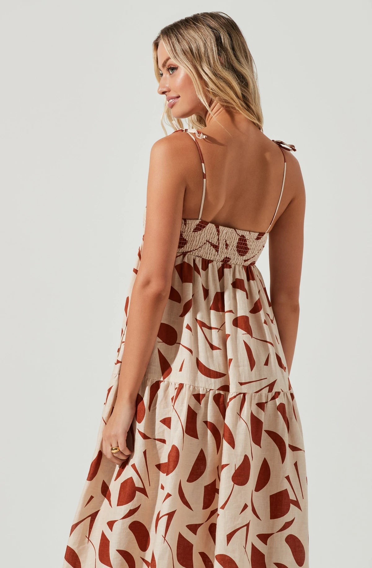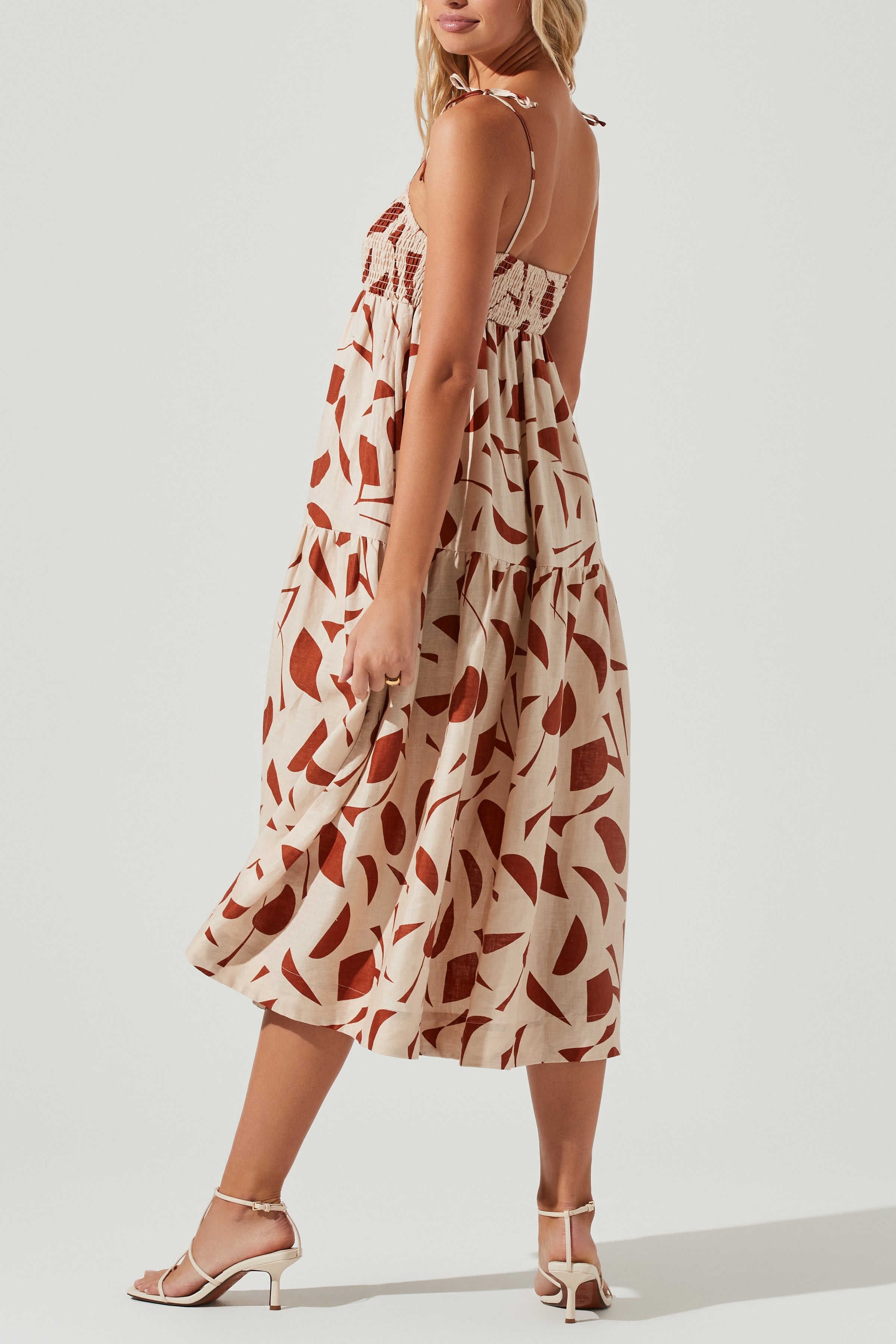 This midi dress features a square neckline, smocked bust and tiered skirt. Self-tie shoulder straps. Side pockets.