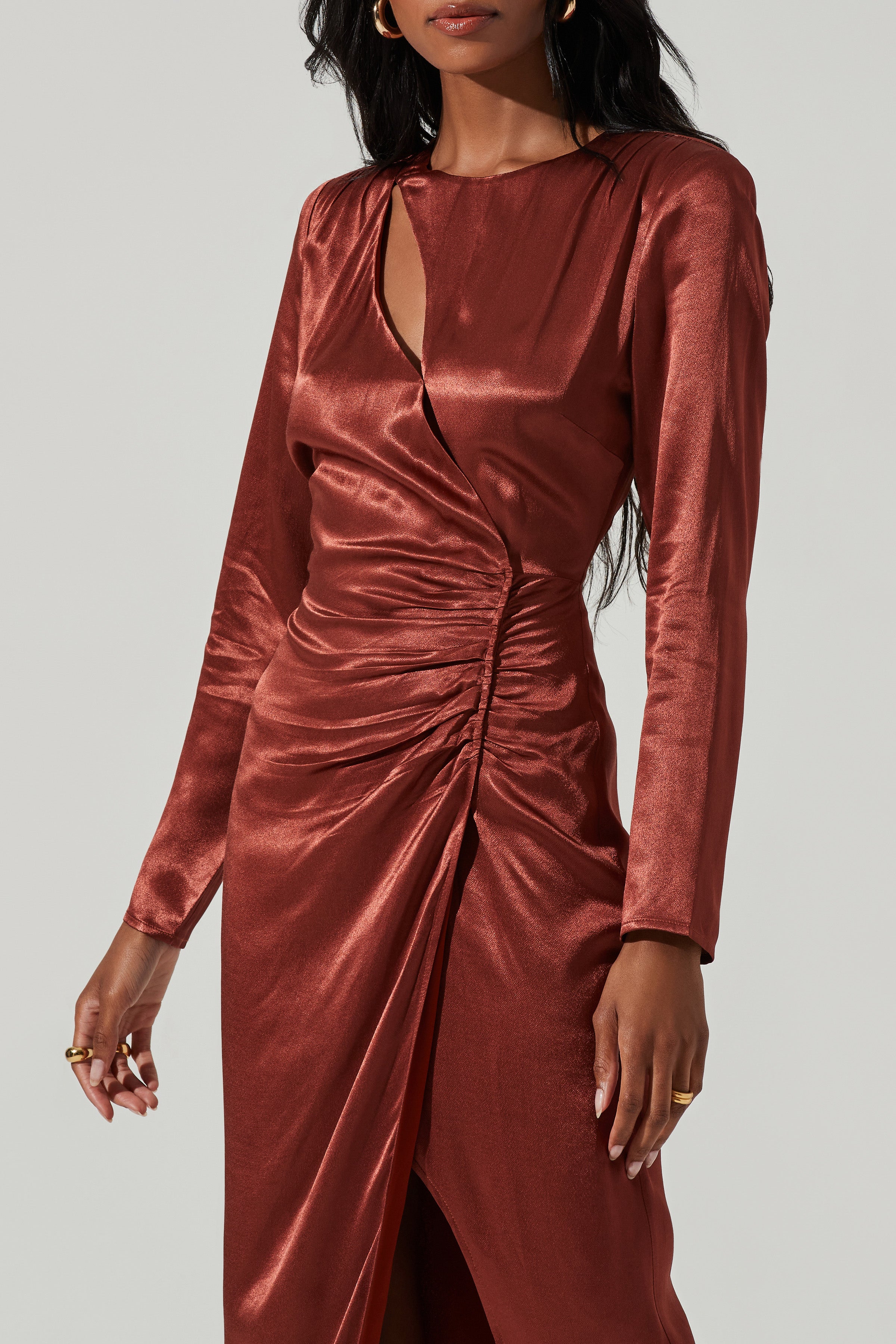 The Mariposa Dress features a satin finish. Asymmetrical cutout neckline leads to a ruched bodice and wrapped midi skirts. Long sleeves. Keyhole back.