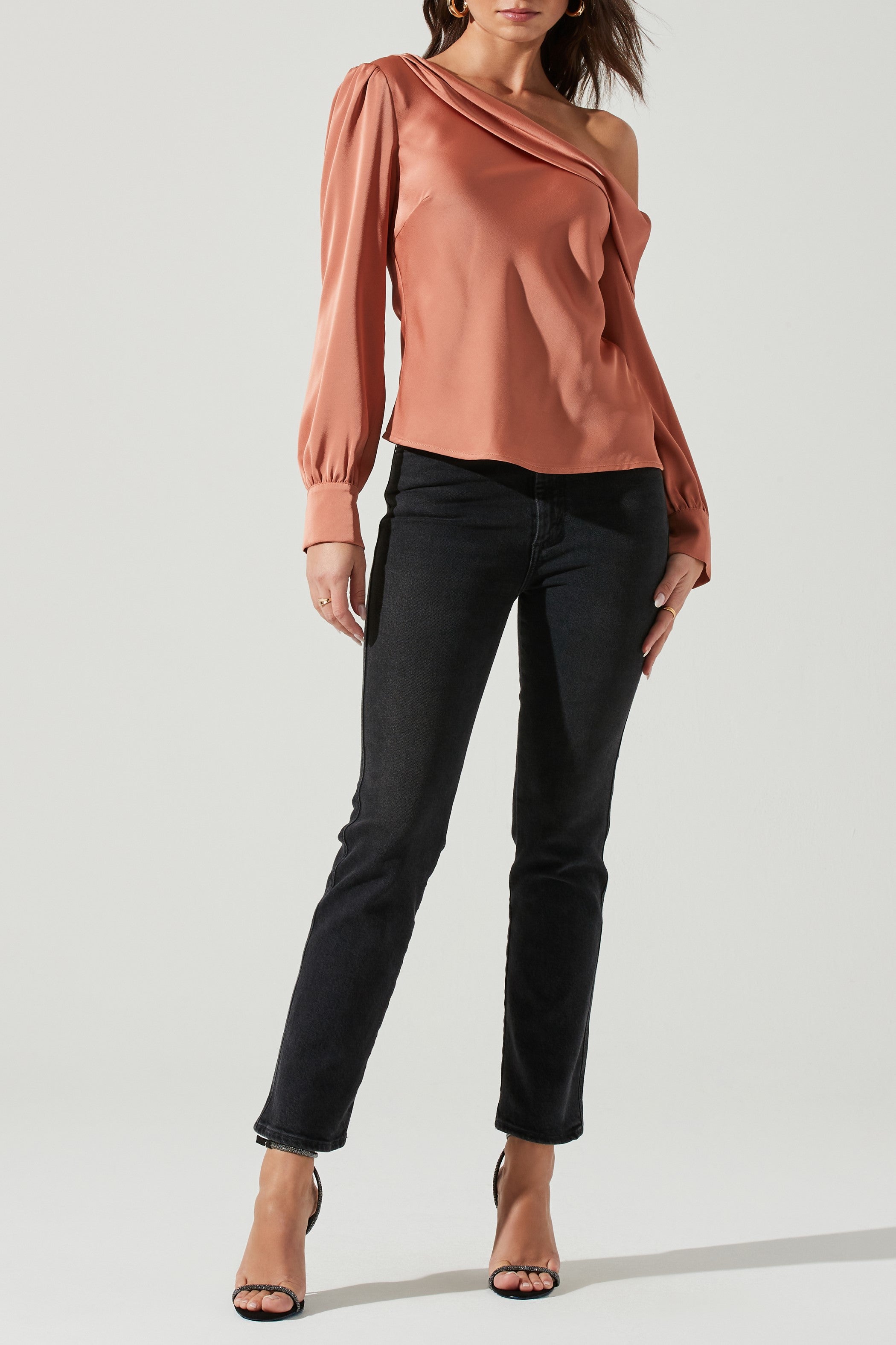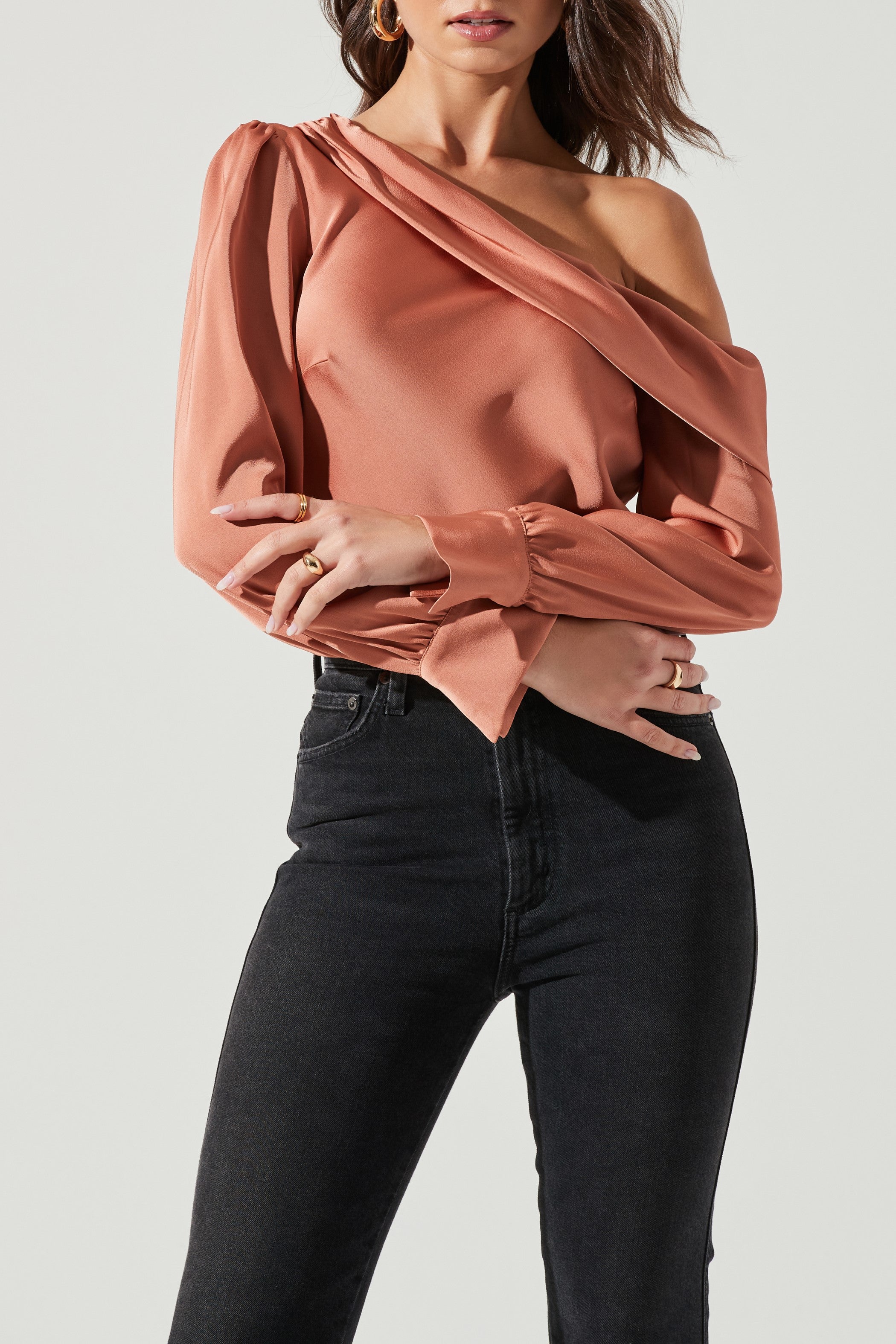 This satin-finish top features an off-shoulder neckline with a draping effect. Long sleeves. Buttoned cuffs.
