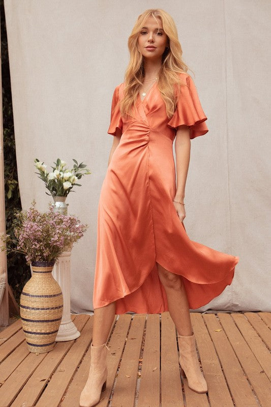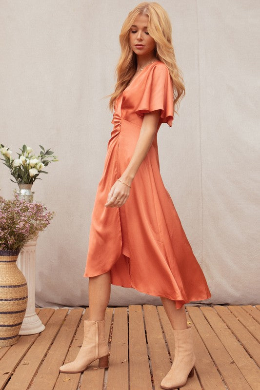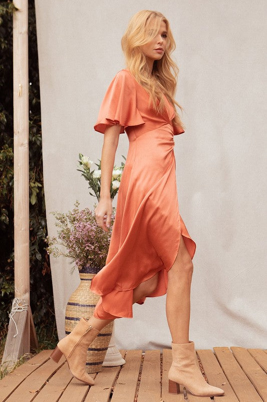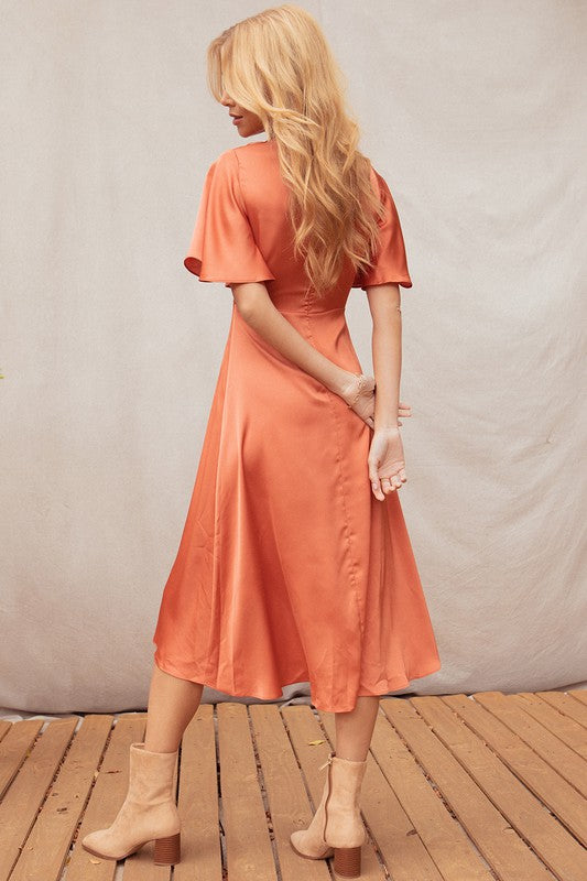 Rust Satin Twist Front Midi Dress