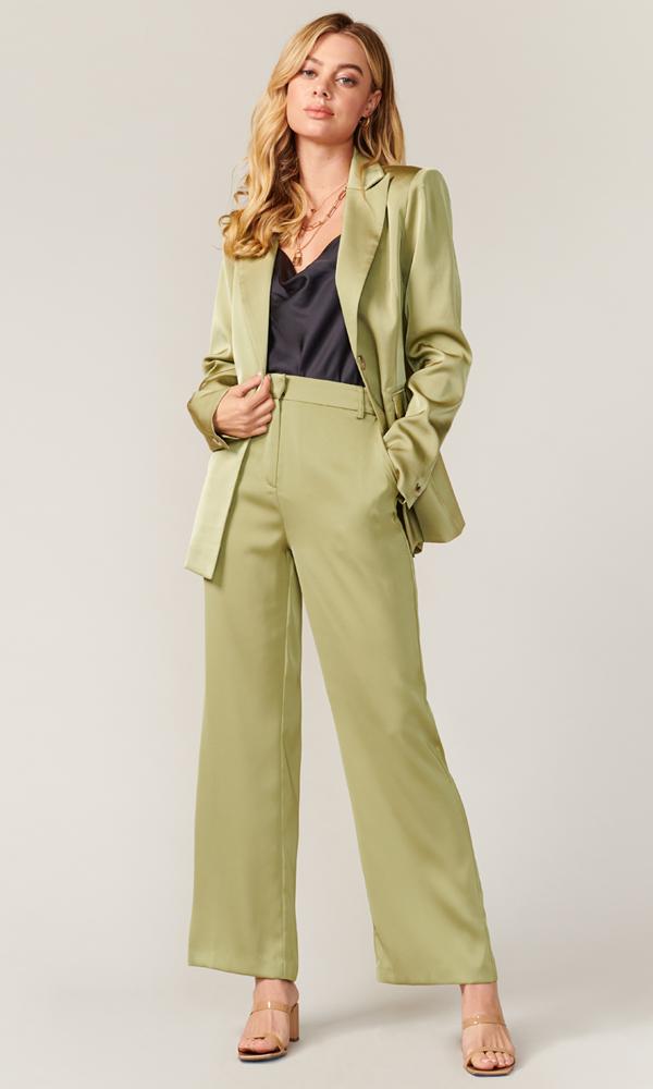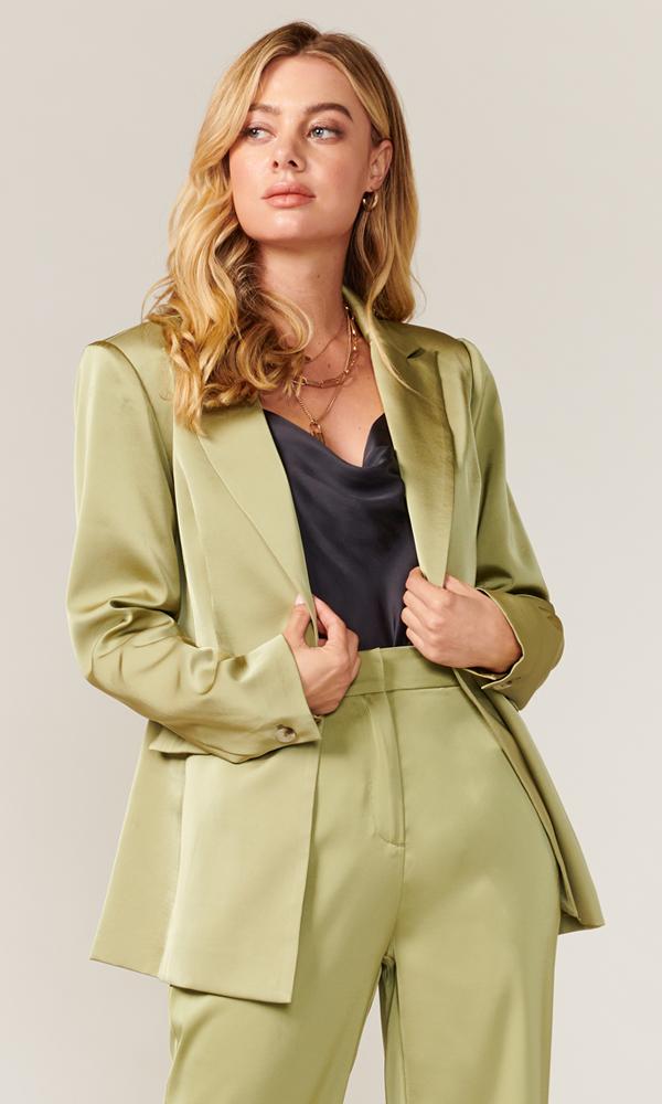 Classic satin blazer featuring side pocket flaps with double welp. Princess seam along front and back. Front button closure.
