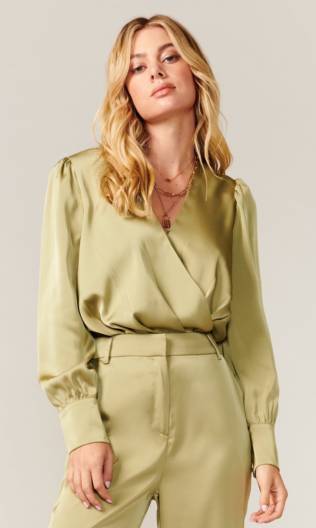 Faux wrap satin blouse featuring a v-neckline and long cuffed sleeves. Button with elastic loop closure along wrists. Light shirring along shoulders. Single pleat along back. Hidden snap closure along front neckline.