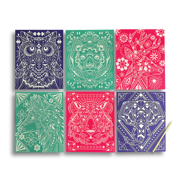 - Includes 6 colored scratch cards with geometrically detailed images of animals