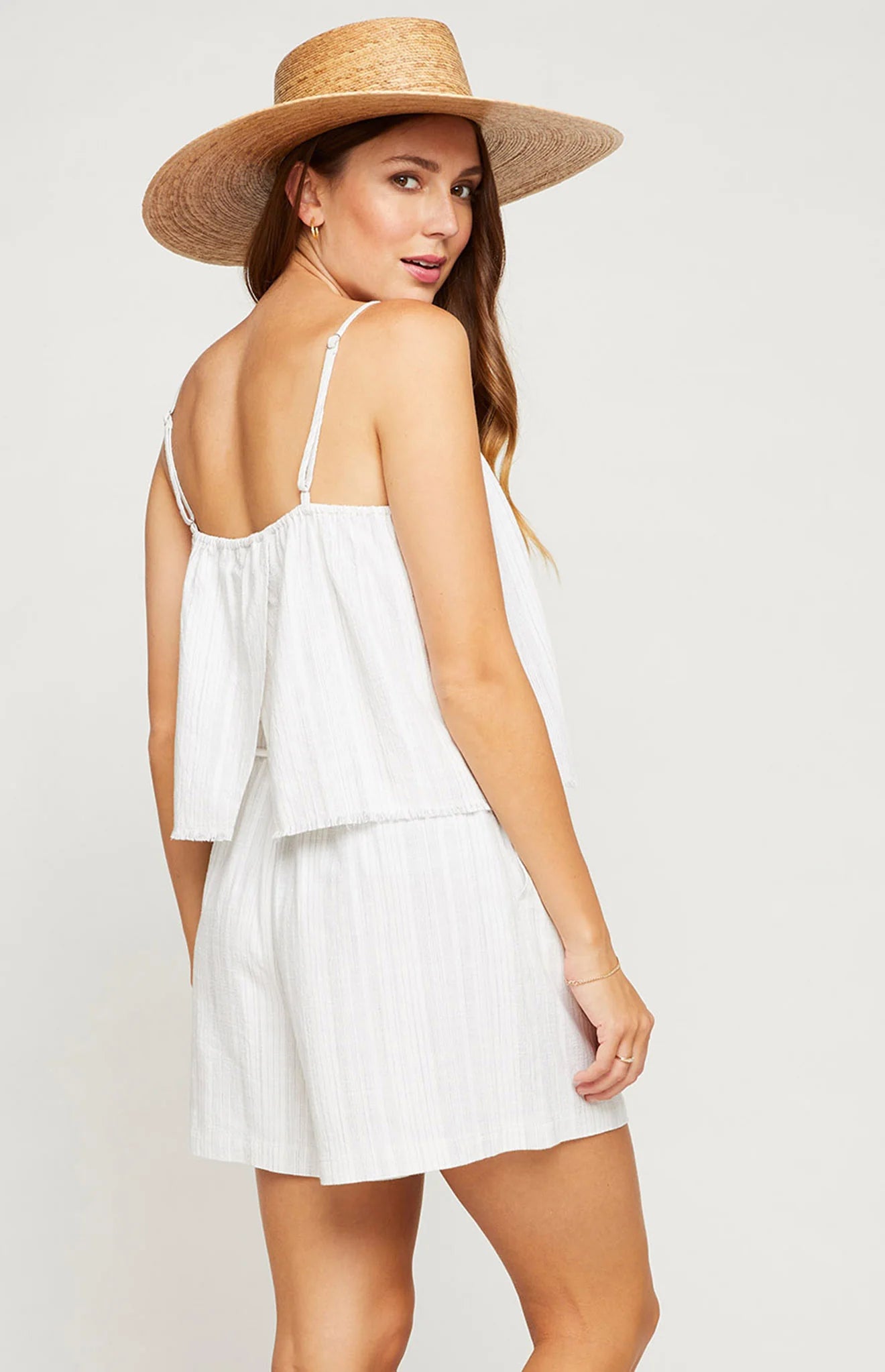 The Mikah tank is made of a linen blend that is perfect for warm weather. Features include adjustable straps, raw edge hemline, and a crossover back detail. Complete the look with the Ariel short or Willow pant.