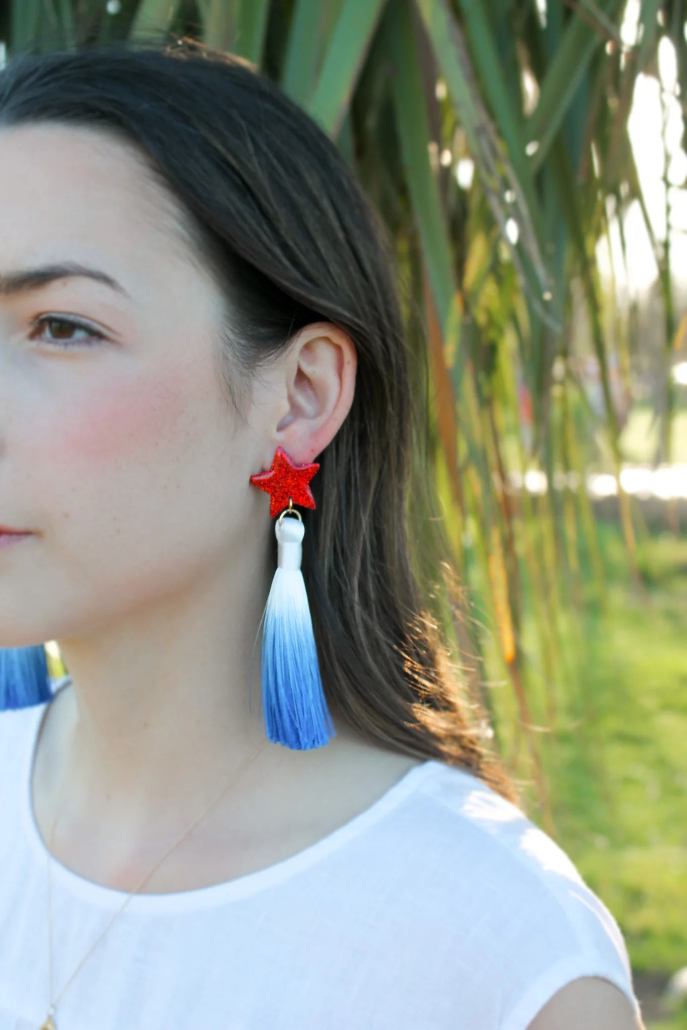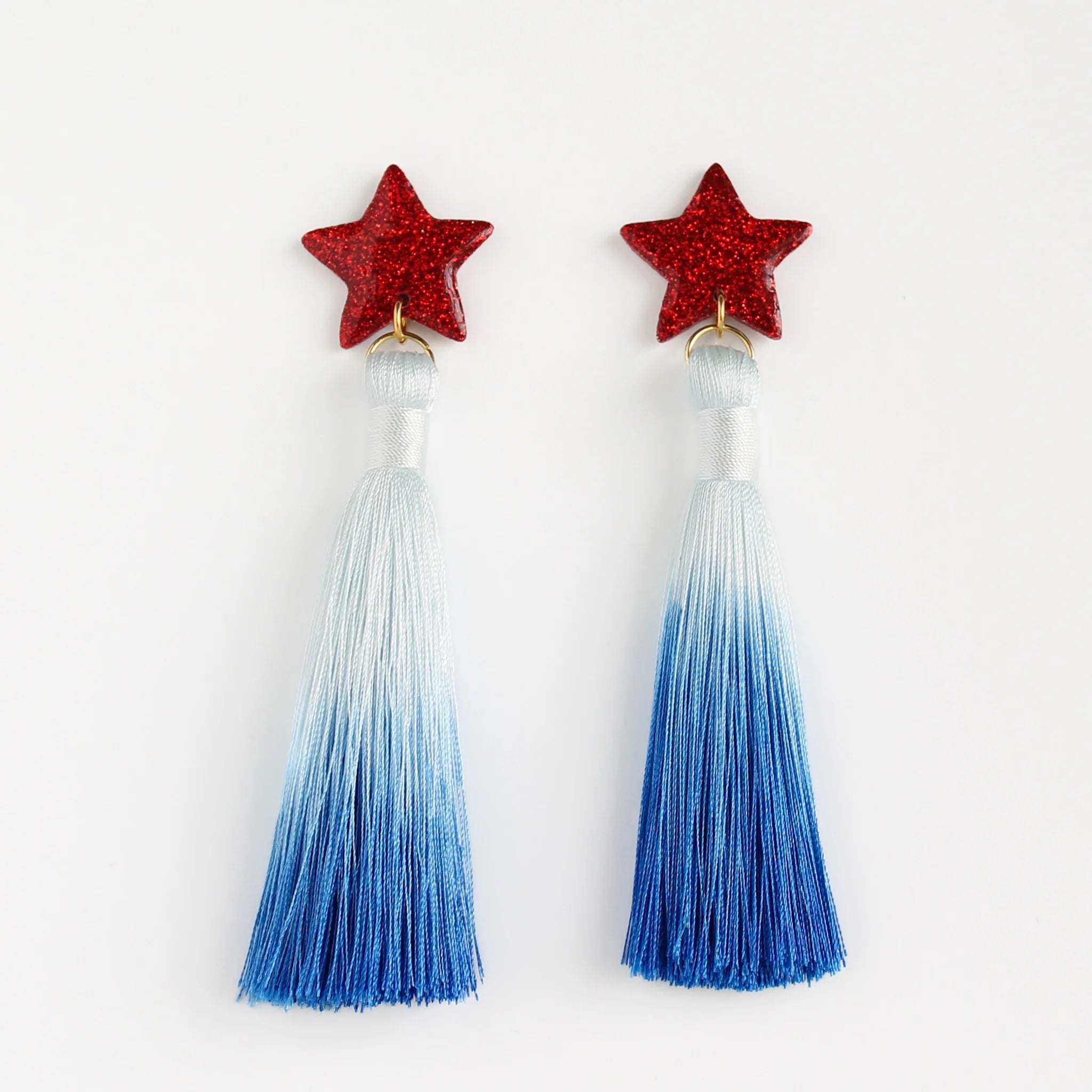 Polymer clay* & Resin; finished with silk tassels, hypoallergenic stainless steel ear posts, and aluminum/PVC push backs.