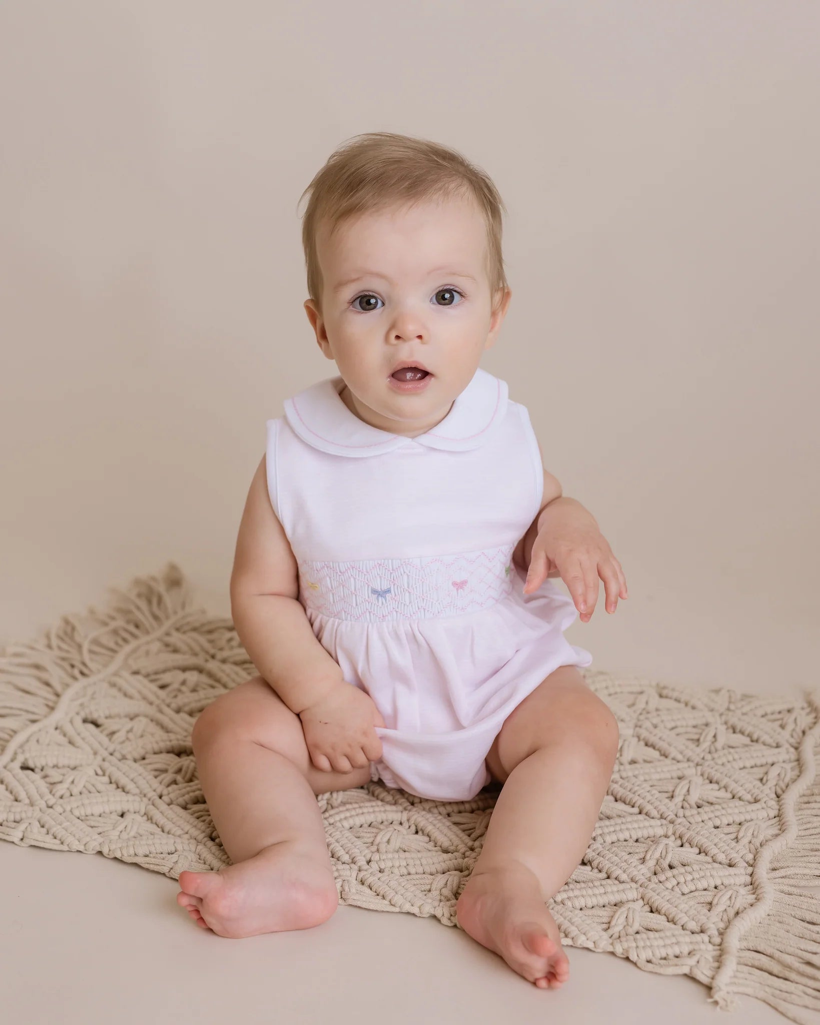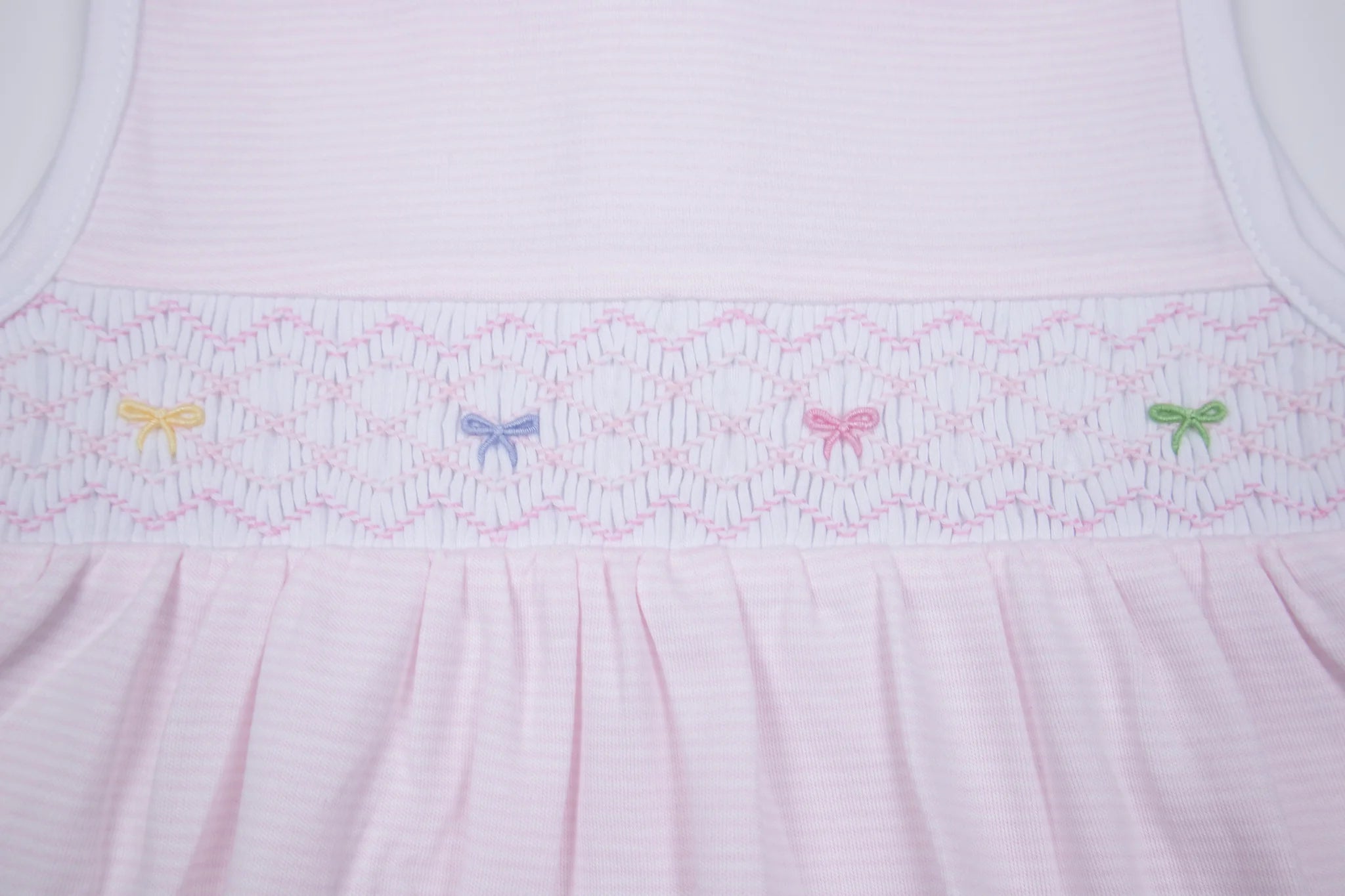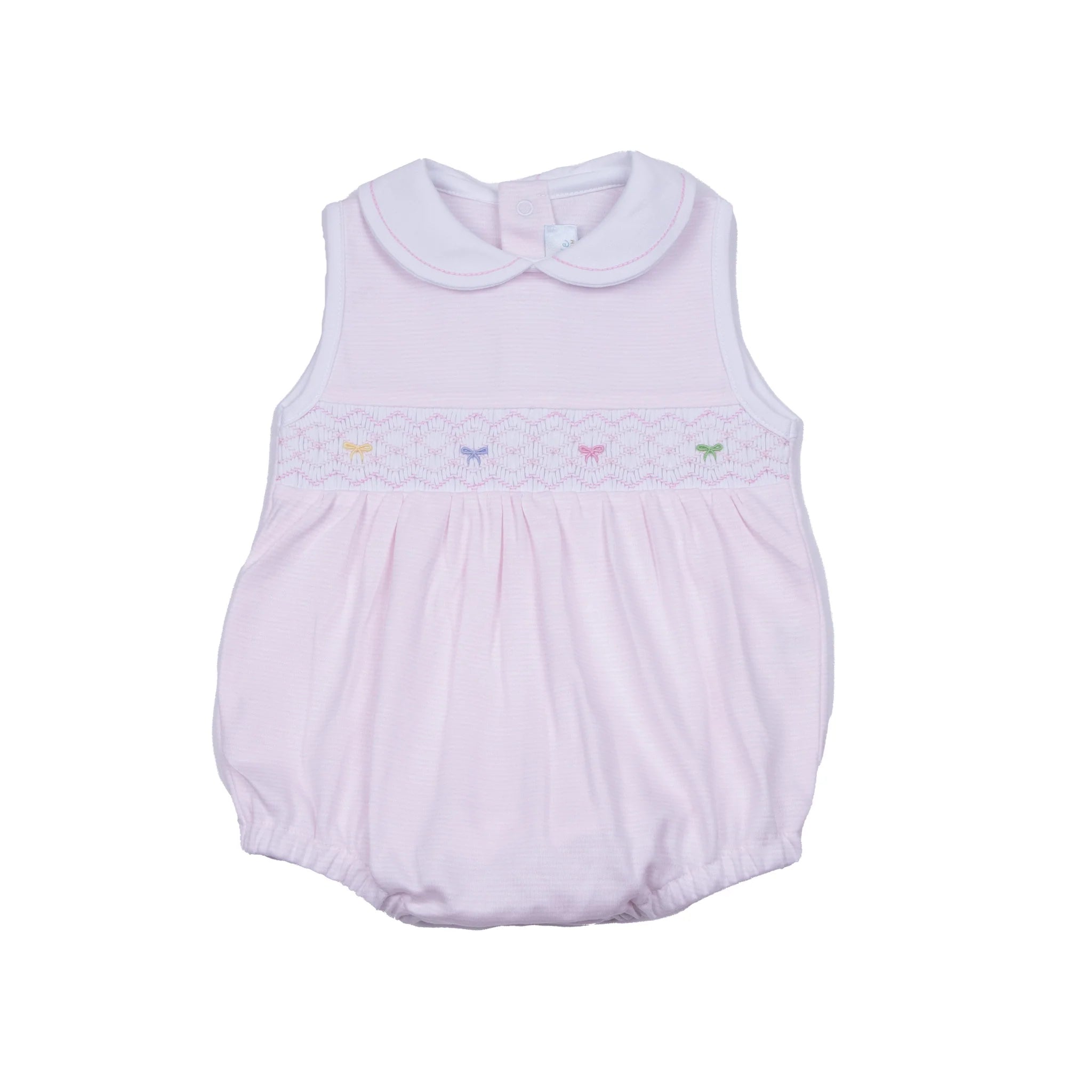 This soft, classic heirloom piece is carefully crafted with hand smocked details and luxurious Pima Cotton fabric. Perfect for any special occasion, this lightweight, pink bubble romper is perfect for your little one, providing comfortable and stylish all-day wear. It has a snap closure at the neck and snap opening at the legs. We recommend washing on a gentle cycle and line dry to protect the quality of the outfit.