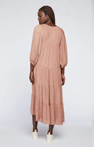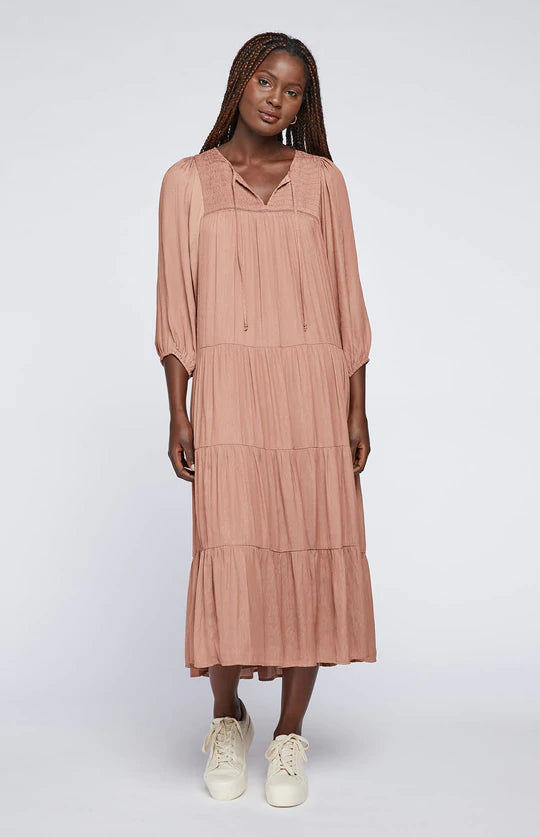 The Harlow dress is made of a silky woven jacquard fabric with a subtle leaf texture. The dress features smocking, trim detailing, and a tiered skirt that drapes and moves beautifully.