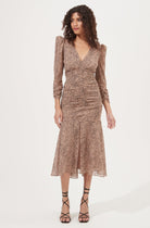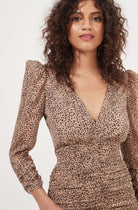 The Medine Dress features a statement leopard print design with a V neckline that leads to a ruched bodice.