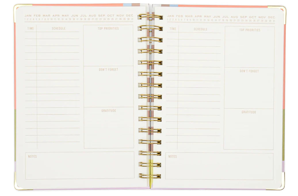 These gorgeous planners add a pop of color to brighten the week, with fill-in-the-date pages and spaces to track daily highlights and to-dos. Each planner is wirebound with a hardback cover and metal corner protectors for durability and a touch of gold finish