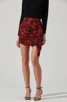 The Waverly Skirt features a statement floral print. High waist leads to a ruched silhouette with a ruffle accent along the side. Concealed zip closure.