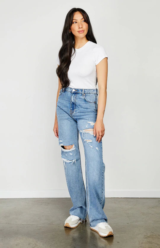 The Clara is a fitted crewneck tee made of a stretchy ribbed fabric. It’s an essential layering piece that can easily be dressed up or down.