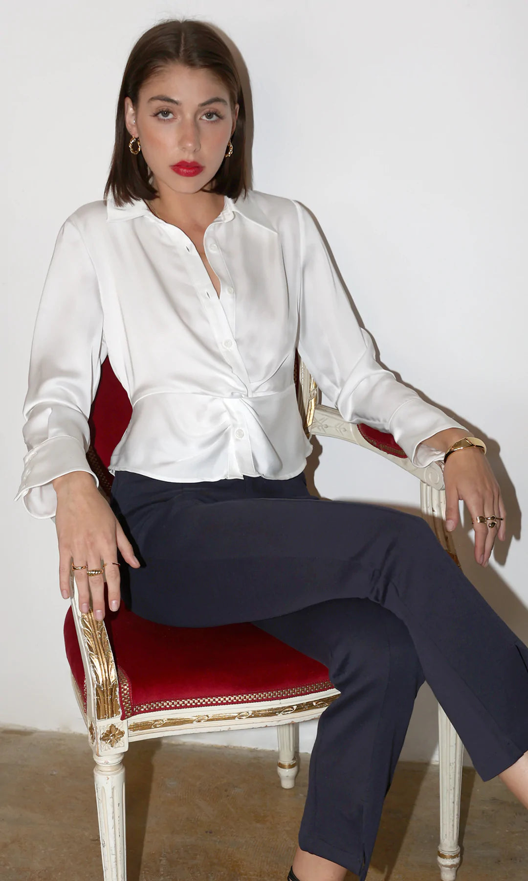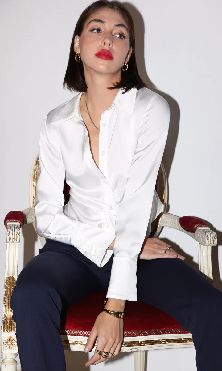 A silk-like, buttoned blouse with gathered twist detail on the front. Because the fabric gathers, it cinched the waist too. This top was made to give a flattering shape to the torso and also upscale the normal look of a button-down shirt.
