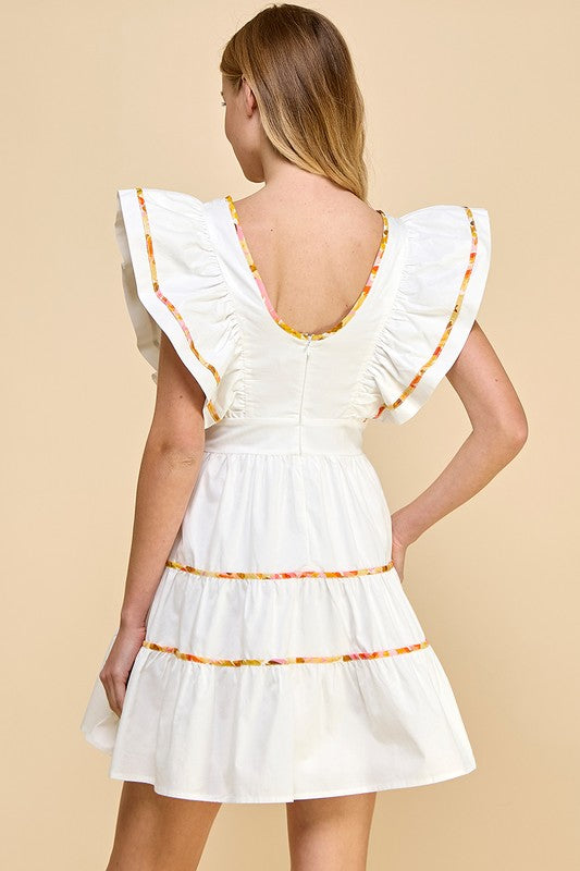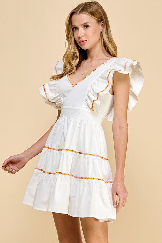V-Neckline, poplin ruffle sleeve dress. Featuring a tiered skirt with a multi color trim and concealed back zipper.