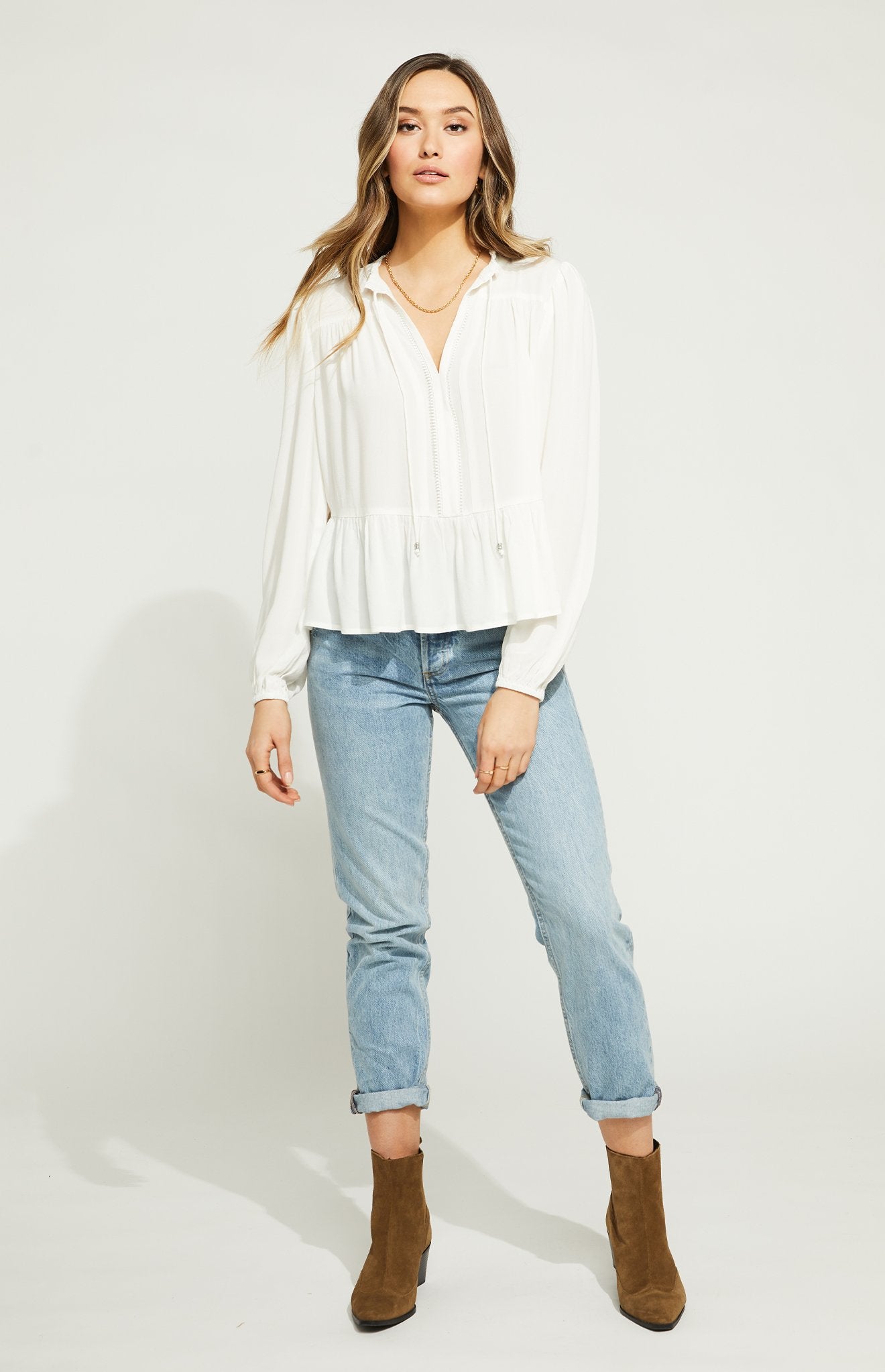 The Marquise top is made of a soft crepe fabric that drapes beautifully. It’s all in the details with lace trim along the neckline, metal bead cord ends, and soft gathers throughout. It’s perfect for everyday wear and can easily be dressed up for date night.